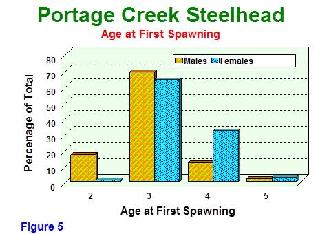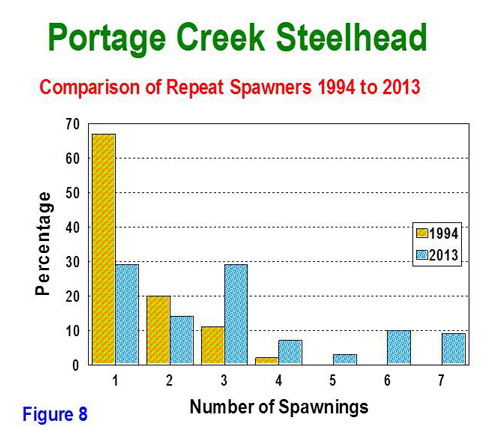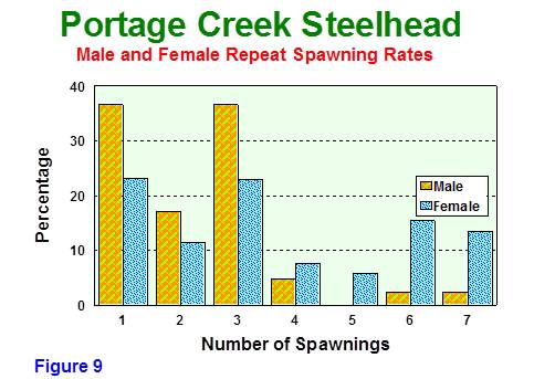 The number of adult steelhead spawning in consecutive years has increased from less than 100 individuals in the early 1990's to over 1000 from 2004 to 2008 (Figure 7). There is generally a higher natural mortality in male fish, resulting in lower repeat spawning numbers for that gender. Following the end of harvest in 1994, survival to multiple repeat spawning for both sexes has increased (Figures 8 and 9). In Portage Creek, repeat spawning steelhead over nine consecutive years has been documented using tag recaptures. In 2013, 71% of the spawning population were repeat spawners. Of this total, 30% had spawned at least four times. This spring, an estimate of 90 adult steelhead were spawning for the fifth to seventh time (validated by tag returns). The repeat spawning rate is abnormally high due to the strong 2004 year class (all repeats in 2013) and the lack of new fish recruiting into the spawning population from subsequent years.